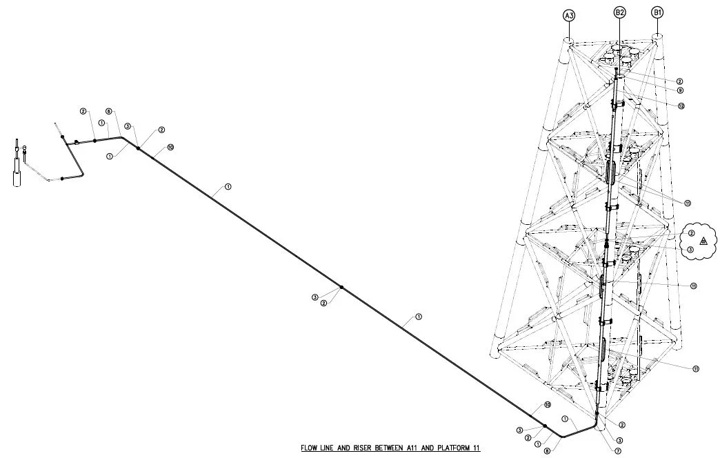 OffshoreTech has been working on a project for client Valkor LLC, for the engineering and design of an in-field flowline and riser installation. The flowline connects a subsea wellhead with a platform 100 meters away from the well. The riser is inside an I-tube for protection, which itself is clamped onto the jacket leg.